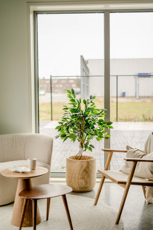 Onze kunstplanten zijn nauwelijks van echt te onderscheiden dankzij het gebruik van hoogwaardig polyester en stammen van echt hout, wat zorgt voor een natuurlijke uitstraling. Ze vergen weinig onderhoud; af en toe afnemen met een zachte borstel of vochtige doek houdt ze fris en mooi. Met een levensduur van 10 tot 15 jaar zijn onze kunstplanten bovendien een duurzame en langdurige keuze.