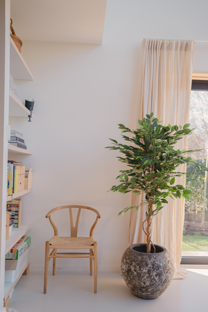 Onze kunstplanten zijn nauwelijks van echt te onderscheiden dankzij het gebruik van hoogwaardig polyester en stammen van echt hout, wat zorgt voor een natuurlijke uitstraling. Ze vergen weinig onderhoud; af en toe afnemen met een zachte borstel of vochtige doek houdt ze fris en mooi. Met een levensduur van 10 tot 15 jaar zijn onze kunstplanten bovendien een duurzame en langdurige keuze.