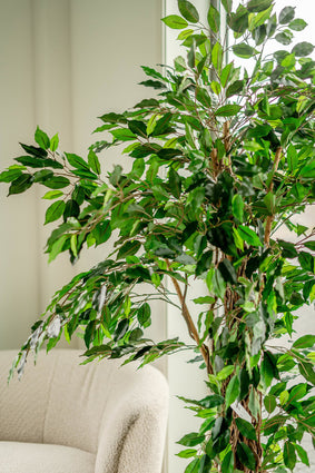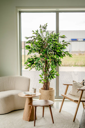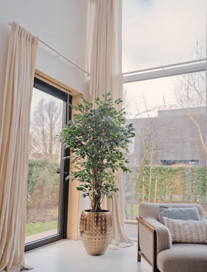Onze kunstplanten zijn nauwelijks van echt te onderscheiden dankzij het gebruik van hoogwaardig polyester en stammen van echt hout, wat zorgt voor een natuurlijke uitstraling. Ze vergen weinig onderhoud; af en toe afnemen met een zachte borstel of vochtige doek houdt ze fris en mooi. Met een levensduur van 10 tot 15 jaar zijn onze kunstplanten bovendien een duurzame en langdurige keuze.