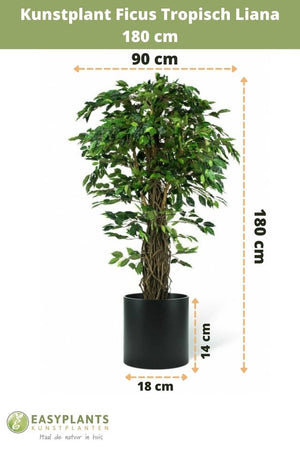 Bent u op zoek naar een mooie, grote kamerplant die u niet hoeft te verzorgen? Misschien gewoon voor thuis of om een kantoor of winkel een fraaiere uitstraling te geven? Kies dan voor deze prachtige kunstplant Ficus Tropical Liana van 180cm. hoog. De grote kunstplant is gemaakt van duurzaam kunststof en gaat daarom zeer lang mee. En verzorgen is dus helemaal niet nodig, lekker makkelijk! Door de stam van echt hout en de mooie afwerking van de bladeren ziet de kunst ficus er zeer natuurgetrouw uit. De sierpot wordt niet meegeleverd, maar gelukkig vindt u genoeg mooie plantenpotten in het assortiment van NeverLeafs. Kunt u meteen mee bestellen!
